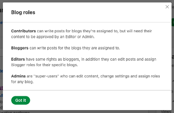 There are different access levels, which give the user different permissions for writing, editing and managing Blogs. There are two types of roles that can be assigned: