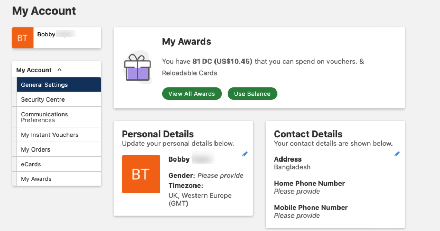 Step 1: Members will be able to see their award balance, in points and currency, on their Account Settings page on the platform by going to Account > My Account.