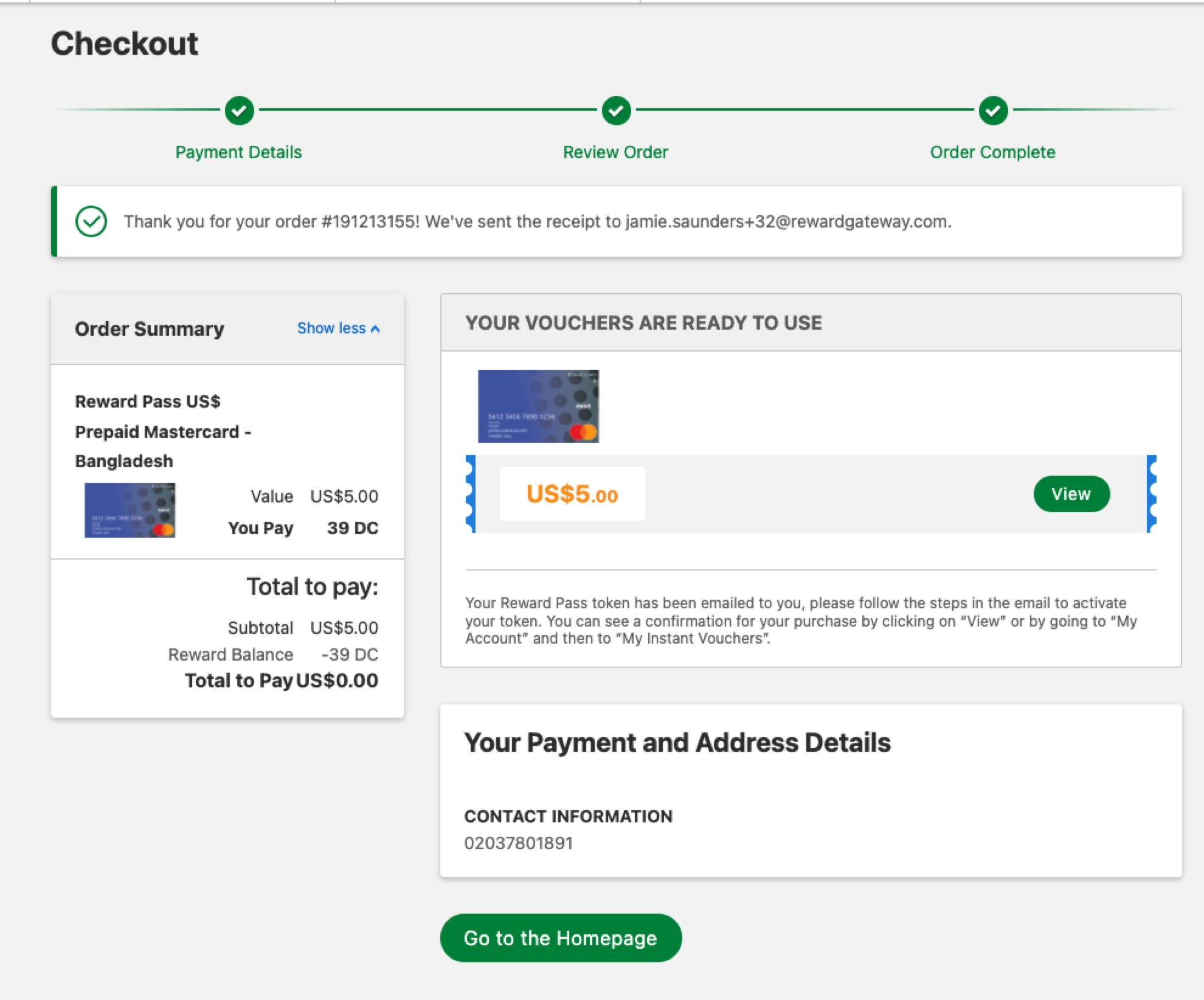 Step 7: The Reward Pass Prepaid Mastercard is instantly recorded on the member's account on the platform. A record of the order can be accessed immediately after completing checkout by visiting the Account Settings page and selecting My Instant Vouchers on the left-hand side menu.