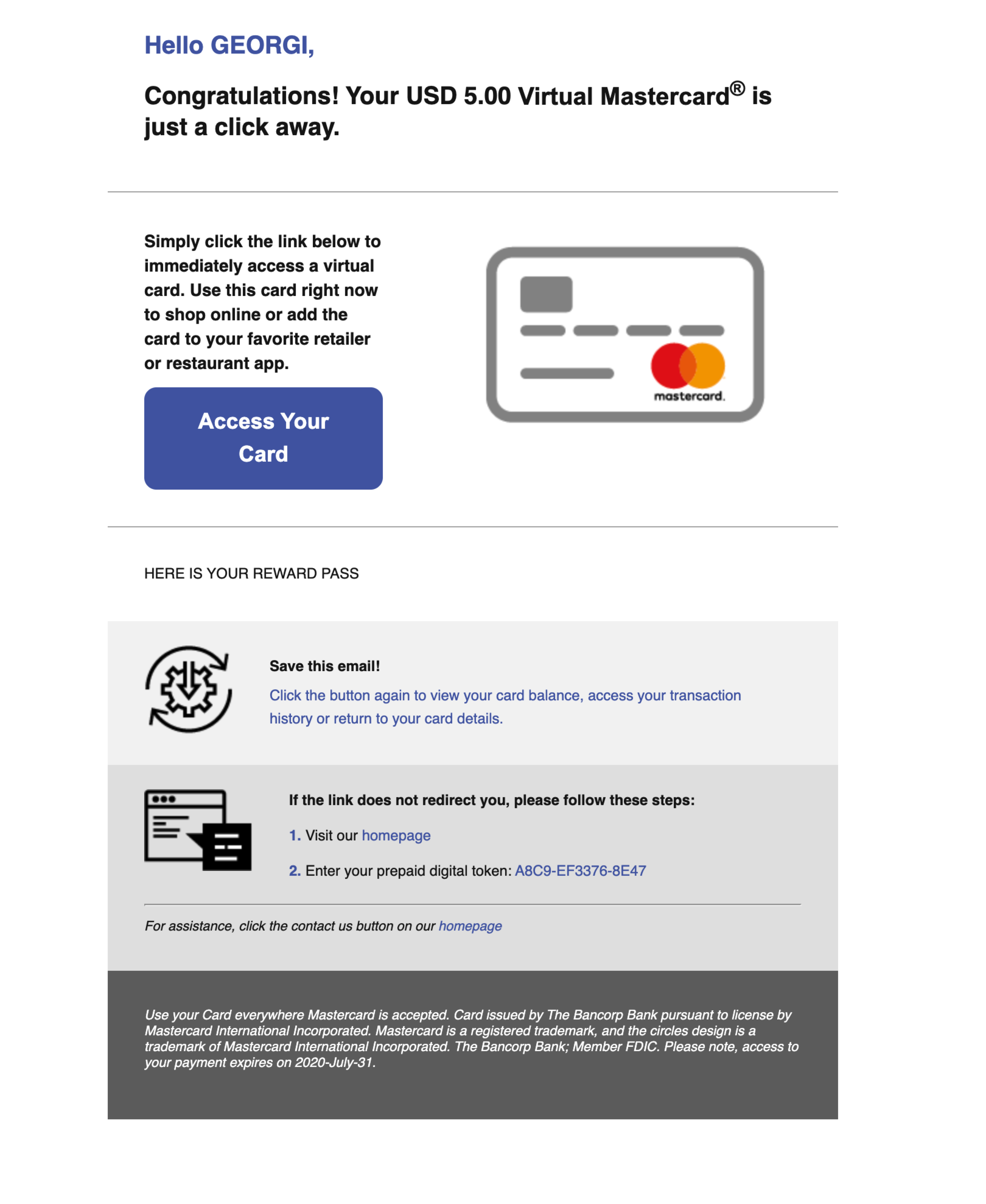 The Reward Pass token will be sent to the member via email and the rest of the process takes places outside of the platform. Note that how the screenshots and following steps appear may vary depending on the suppliers of the prepaid card.