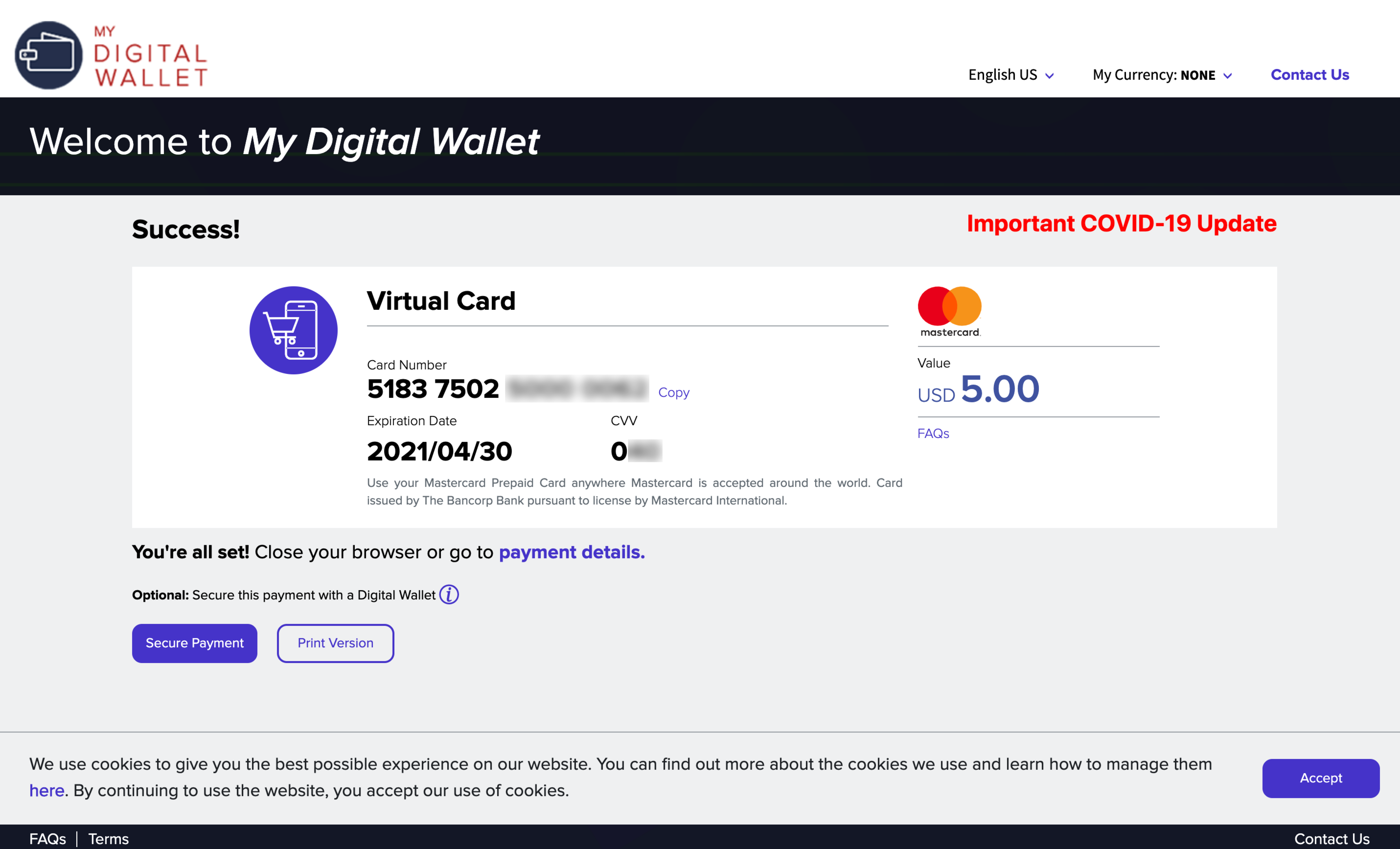 Step 11: The virtual card details will be available (or if a physical card has been chosen, the relevant information on packing and shipping times will be displayed instead).