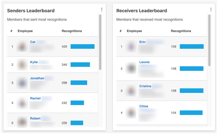 The 10 users who have sent and received the most recognition during the selected time period are shown in these leaderboards, alongside the number of recognitions sent and received.