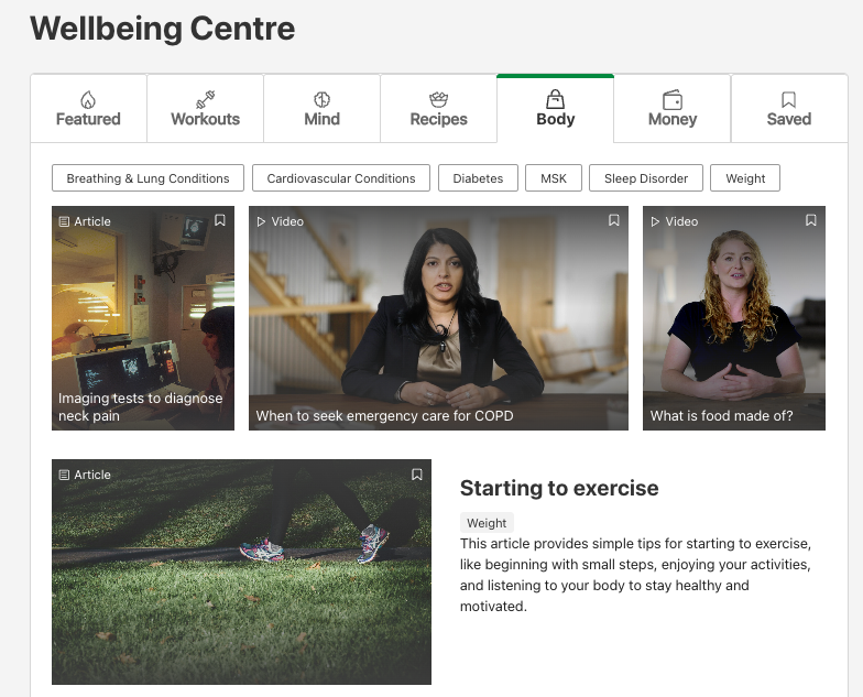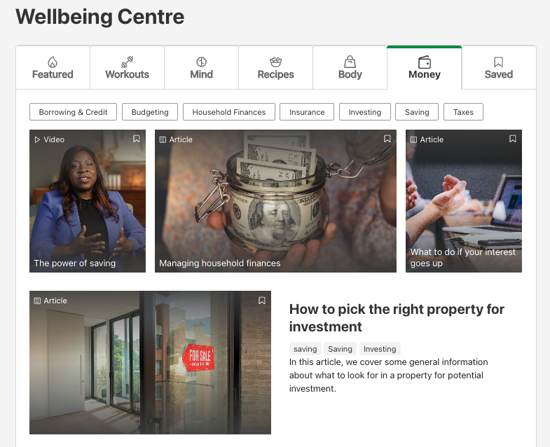 The Wellbeing Centre is split into three categories of Workouts, Mind, Recipes, Body and Money – designed to provide easy access to the wellbeing information which suits employees best.